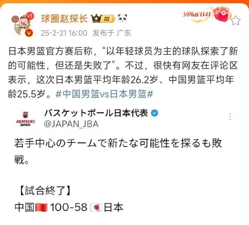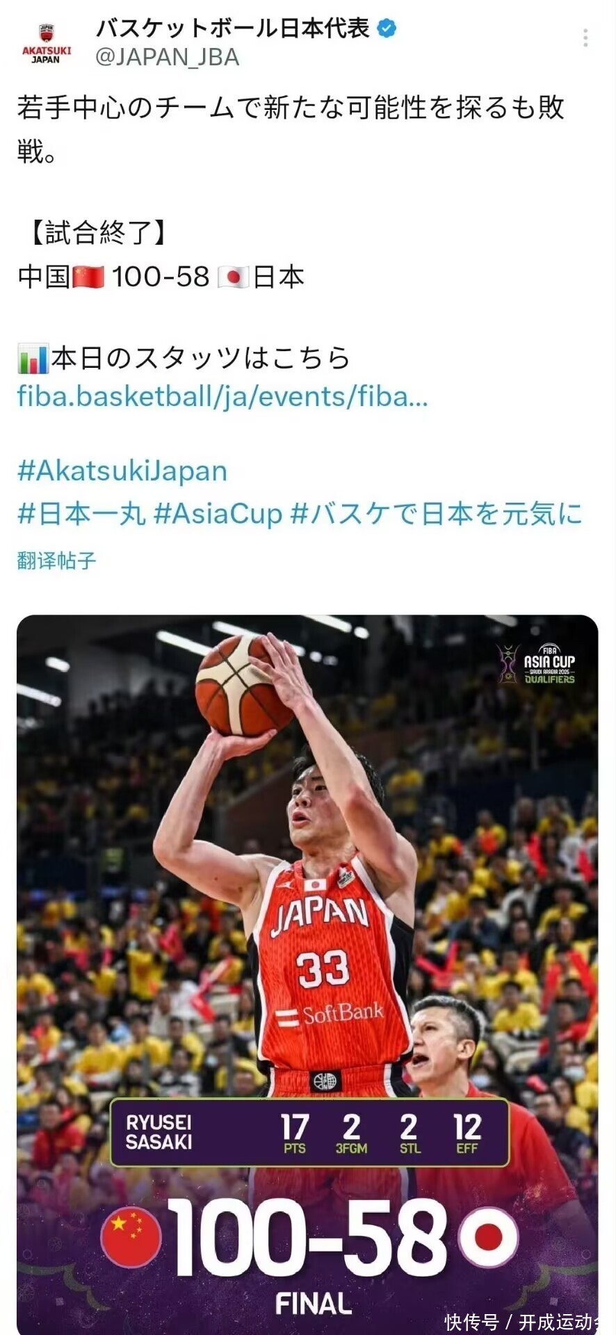 媒体人赵探长表示:大比分不敌中国男篮,日本男篮官方赛后称,以年轻球员为主的球队探索了新的可能性,但还是失败了。